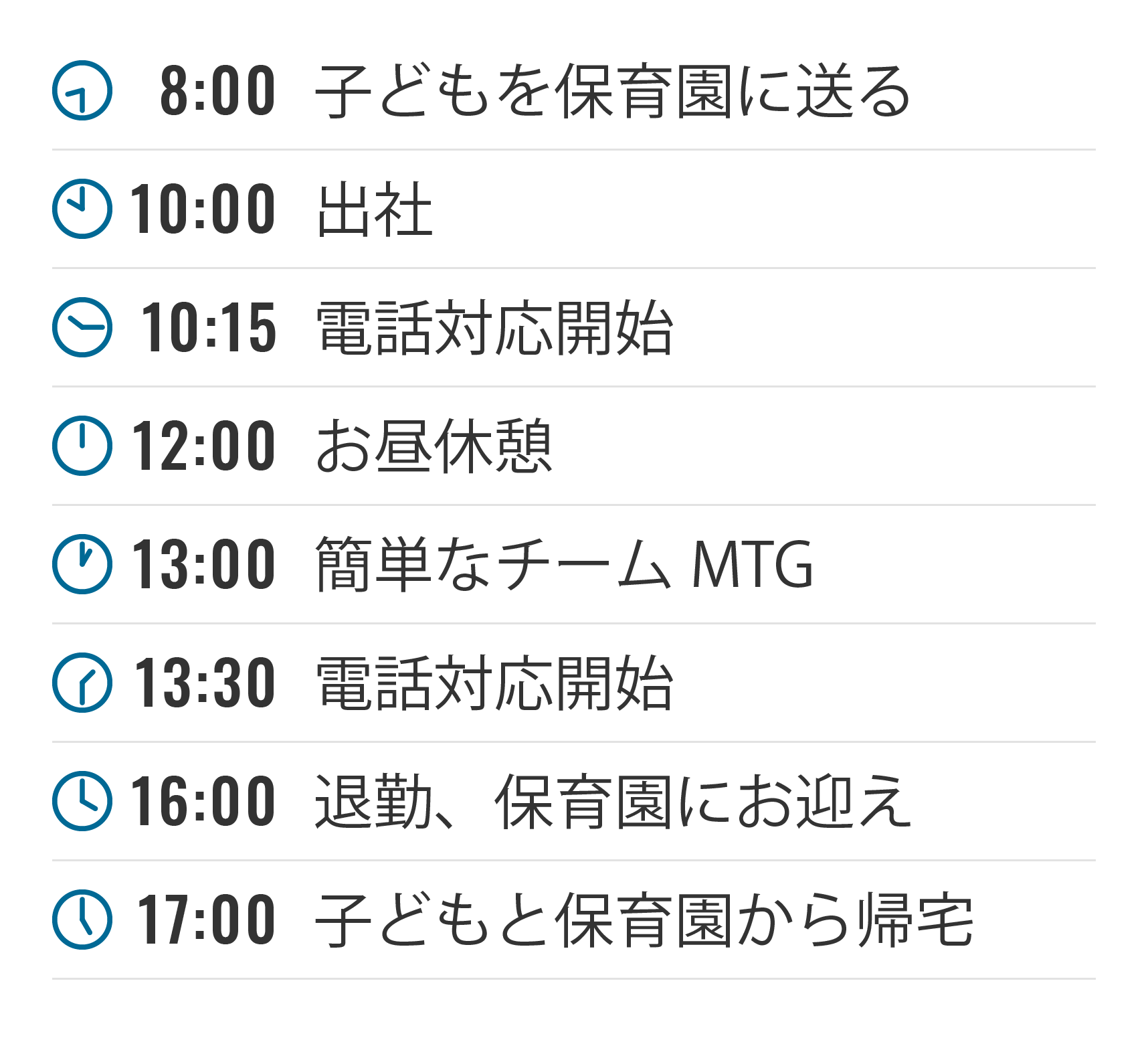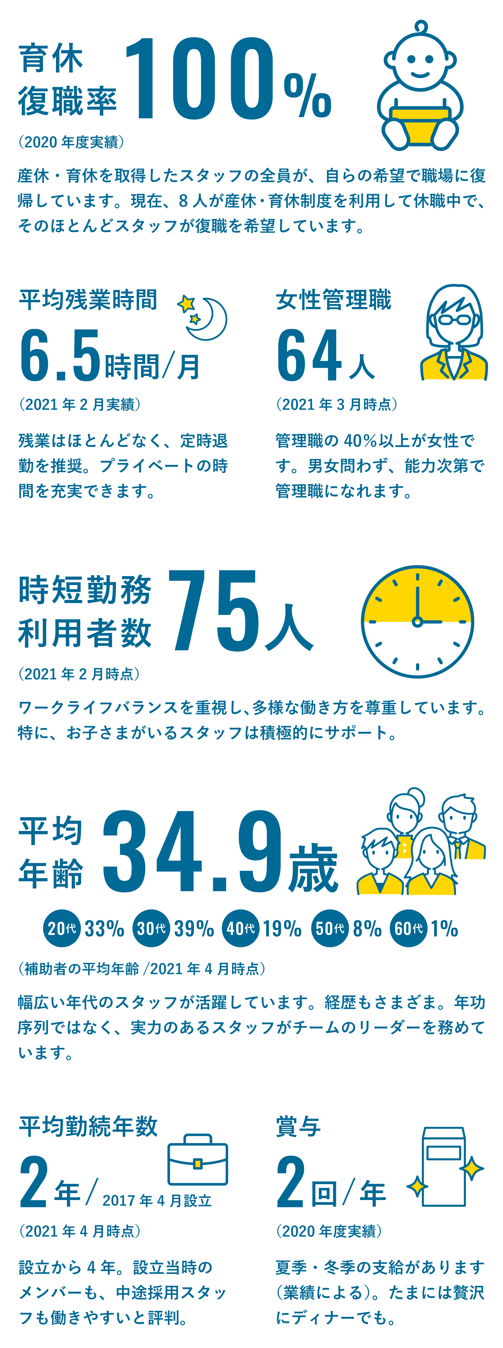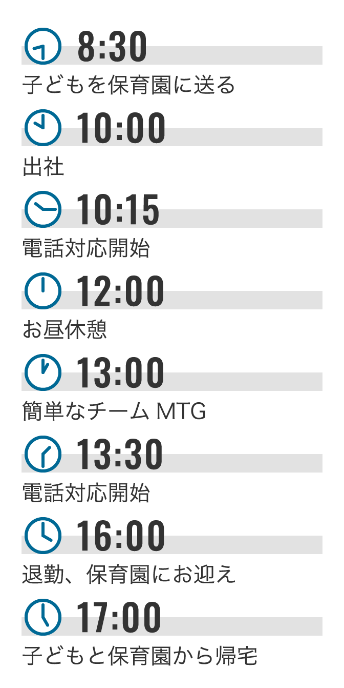 子どもの保育園のお迎えがあるので 16 時には上がらせてもらっています。周囲の方や上司の方からも理解を得られていて助かっています。小さい子どもがいると、急な欠勤などがどうしても発生してしまうんですが、皆さん、休め休めと言ってくださいます(笑)